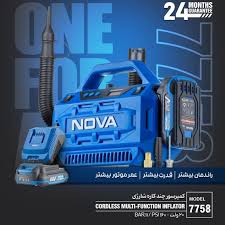 کمپرسور باد چندکاره شارژی نوا مدل 7758, ابزاری ضروری و همهکاره است که به شما آزادی عمل بیسیم را در تنظیم باد انواع تایر و وسایل بادی میدهد.